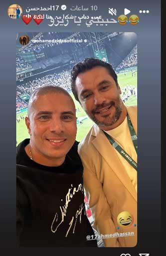 وحرص أحمد حسن قائد منتخب مصر السابق، على نشر صورة له رفقة محمد زيدان نجم المنتخب السابق، من داخل ملعب المملكة أرينا، خلال مشاهدتهم مباراة السوبر الأفريقي.