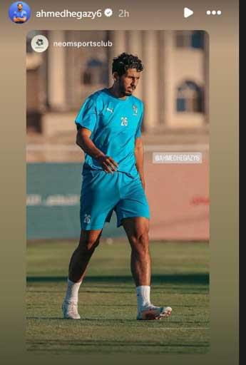 وشارك أحمد حجازي نجم منتخب مصر ونادي نيوم السعودي، متابعيه على موقع تبادل الصور والفيديوهات صورة له، خلال تواجده في التدريبات الخاصة بفريق نيوم.