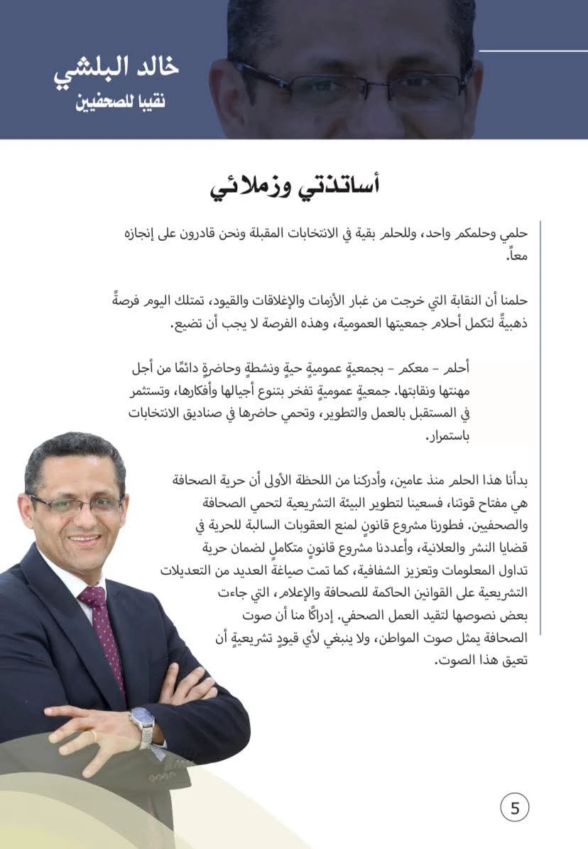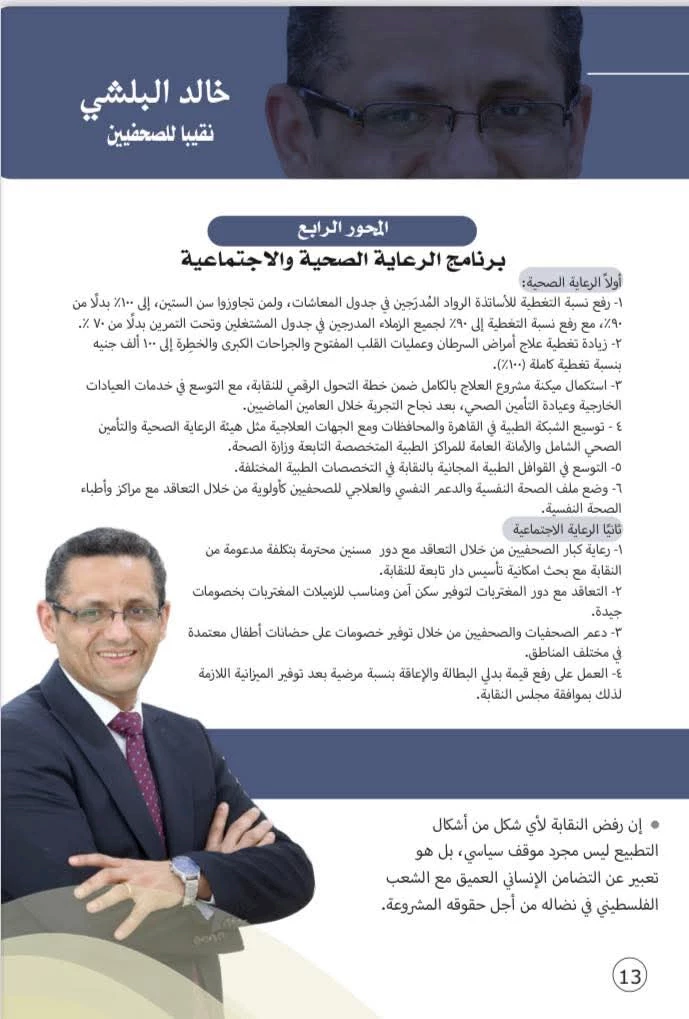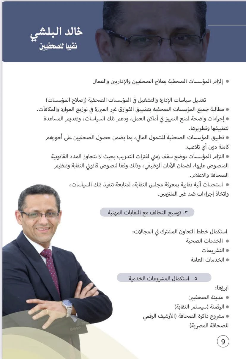 وأعلن البلشي تفاصيل برنامجه الانتخابي والذي جاء على النحو التالي: