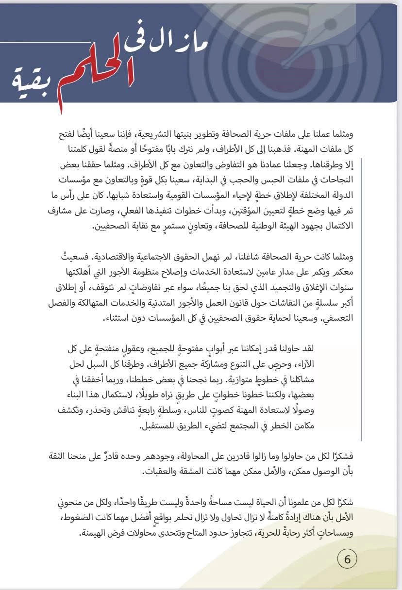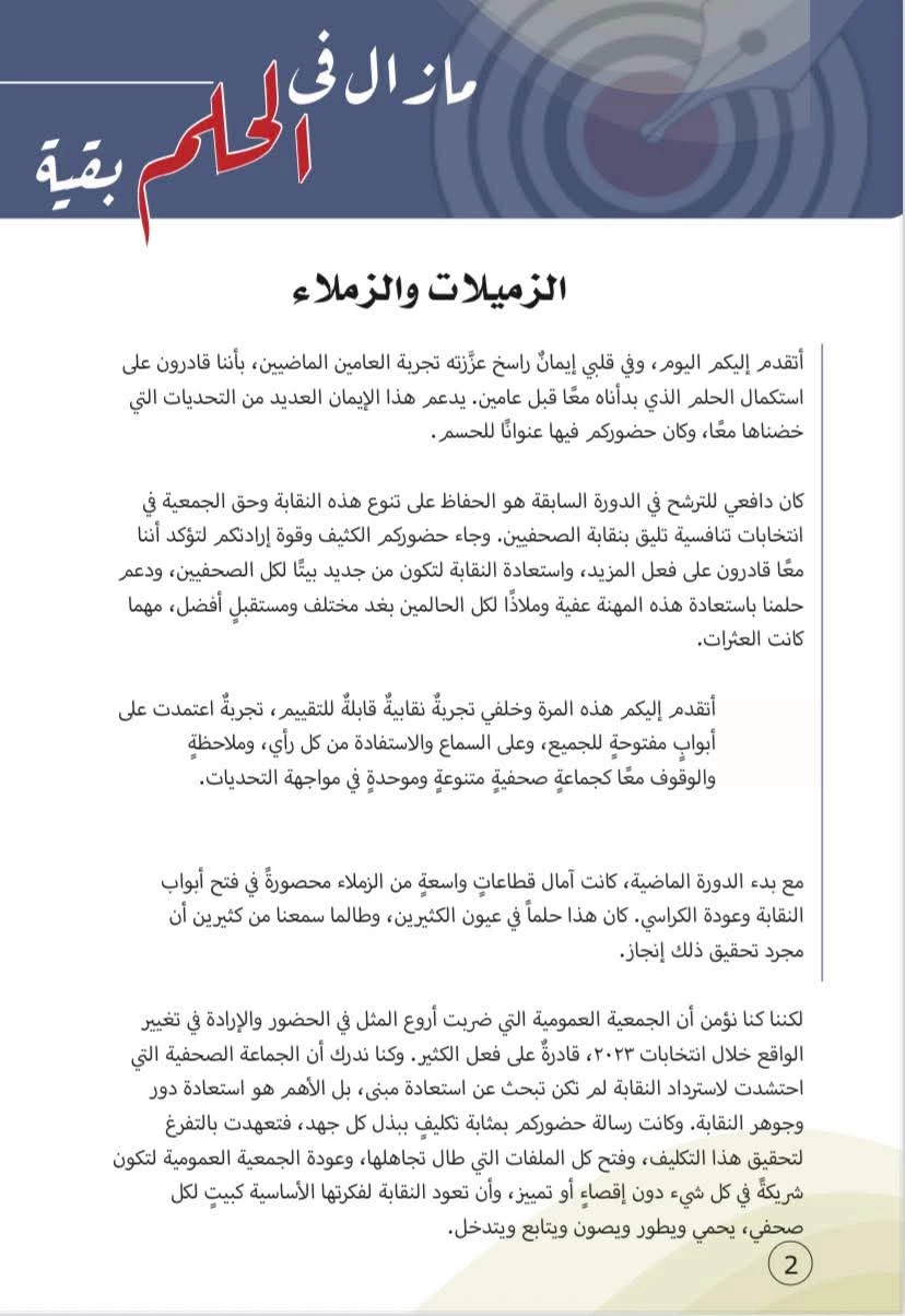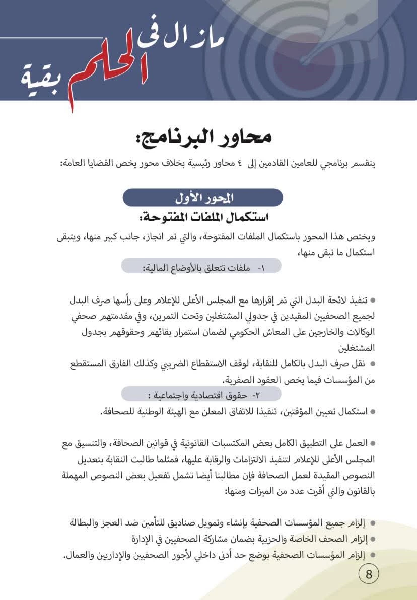 وأولويتنا القصوى هي العمل الدءوب على تنفيذ جميع تلك التوصيات وإيجاد مسارات متوازية لتطبيقها، من خلال استمرار حملات التواصل مع مختلف جهات الدولة التنفيذية والتشريعية، والهيئات المستقلة والحكومية المختصة، وتوعية الزملاء الصحفيين بالتأثير الإيجابي الأكيد لهذا الحراك على أوضاعهم الاقتصادية والمهنية.