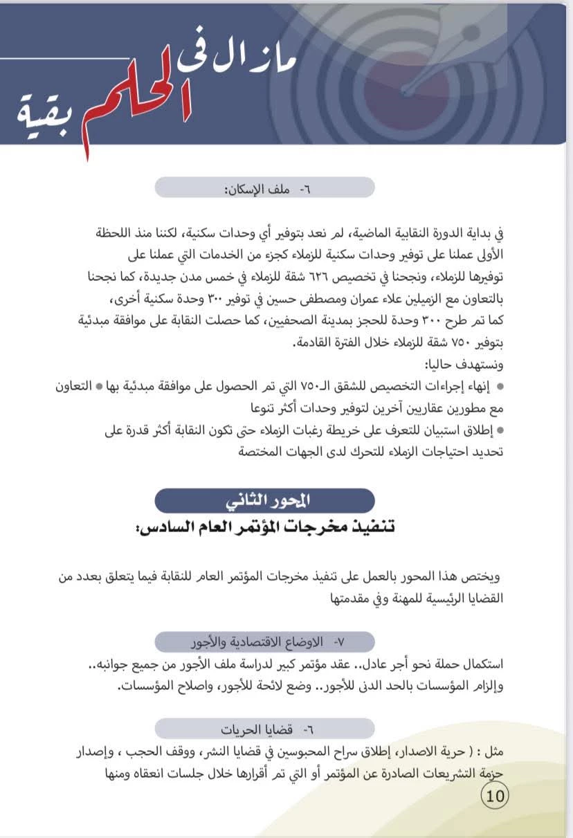 - إنهاء إجراءات التخصيص للشقق الـ750 التي تم الحصول على موافقة مبدئية بها بعد استكمال الاجراءات القانونية للطرح بالتعاون مع وزارة الإسكان. وستسعى النقابة كما سعت في العامين الماضيين لتحقيق اكبر استفادة ممكنة للزملاء.