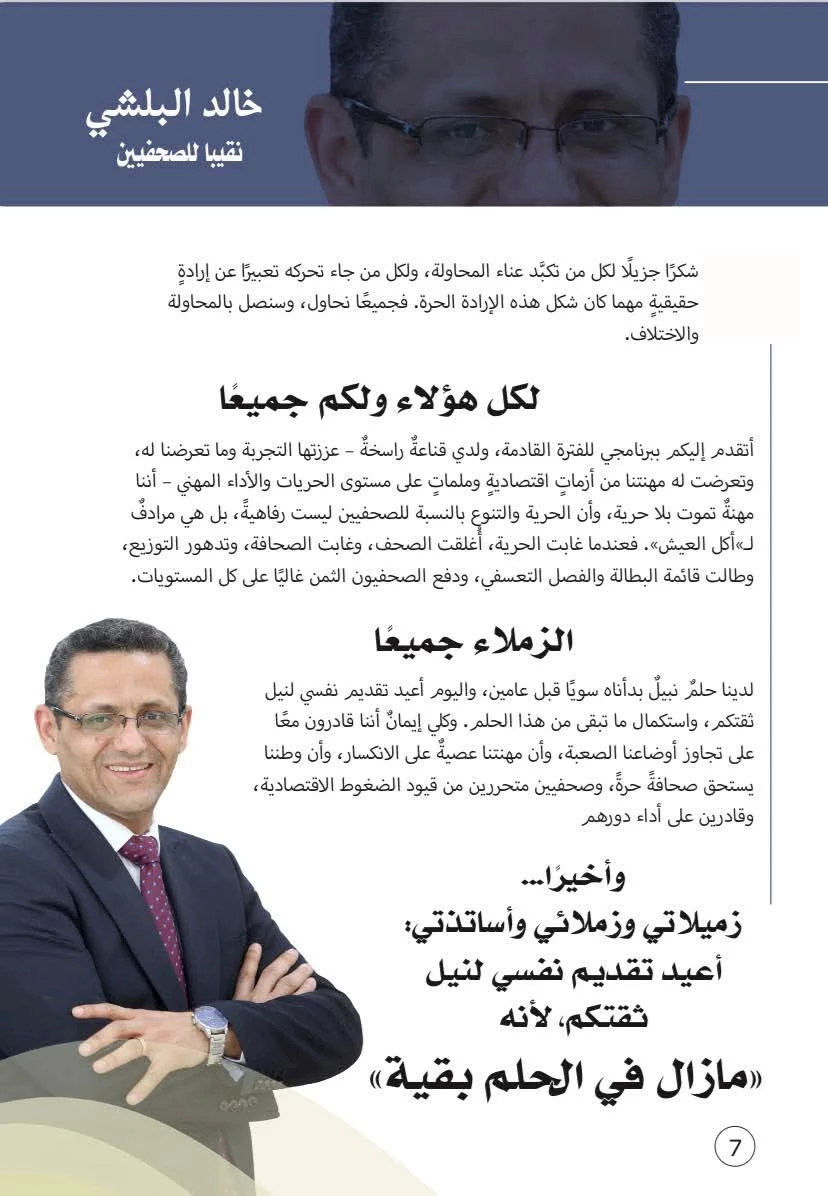عقد الكاتب الصحفي خالد البلشي، المرشح على مقعد نقيب الصحفيين خلال انتخابات التجديد النصفي، مؤتمرًا صحفيًا تحت شعار "ما زال في الحلم بقية"، بمقر نقابة الصحفيين.