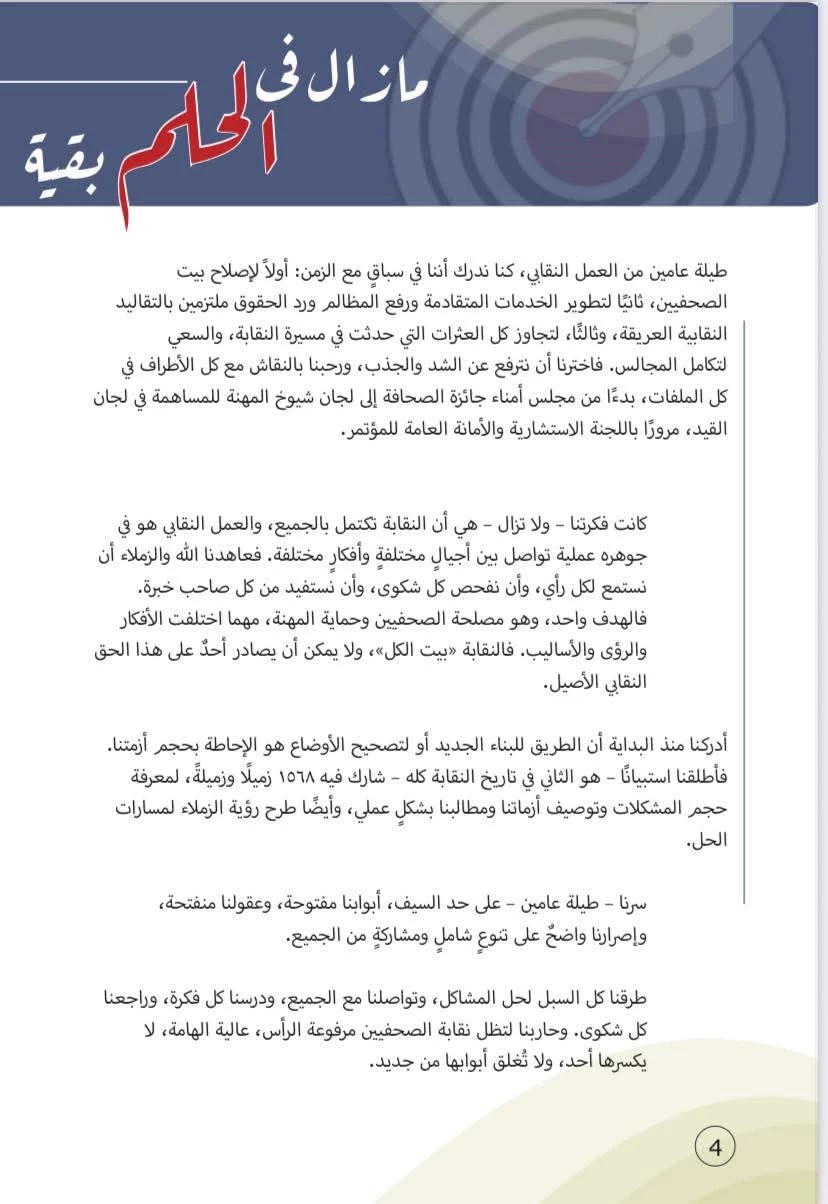 ويأتي ذلك تتويجا لمفاوضات خاضتها النقابة مع جميع الأطراف، وبتفاهم واضح مع الهيئة الوطنية للصحافة، لتبدأ إجراءات التعيين والتي بدأت لتنتهي وهي الخطوة التي يجب ان نوجه فيها الشكر العميق للمهندس عبدالصادق الشوربجي رئيس الهيئة الوطنية.
