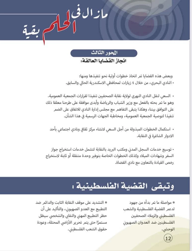 التشديد على موقف النقابة الثابت والدائم ضد التطبيع مع العدو الصهيوني، والتأكيد على أن حظر التطبيع المهني والنقابي والشخصي سيظل مستمرًا حتى يتم تحرير الأراضي المحتلة، وعودة حقوق الشعب الفلسطيني.