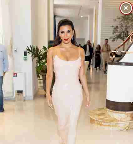 ارتدت الممثلة الأمريكية إيفا لونغوريا فستان طويل كت باللون البيج اللامع، ونسقت مع إطلالتها حذاء باللون البيج، واعتمدت مكياجا قويا إذ وضعت أحمر شفاه باللون الأحمر.