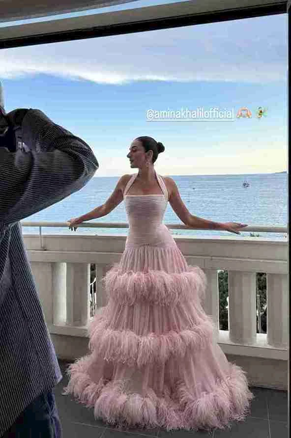 ظهرت الفنانة أمينة خليل بفستان باللون البينك الوردي بصيحة الريش، واعتمدت مكياجا ناعما، واختارت تصفيفة الشعر المرفوع لأعلى.
