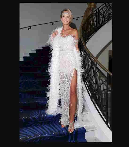 أطلت عارضة الأزياء الأمريكية فيكتوريا هيرفي بفستان جريء باللون الأبيض بصيحة الريش ومزود بفتحة ساق جريئة، واعتمدت تصفيفة الشعر المرفوع لأعلى.