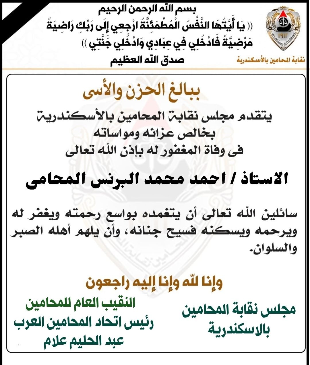 ونعت نقابة المحامين بالإسكندرية المحامي الراحل في بيان عبر صفحتها الرسمية على موقع التواصل الاجتماعي فيس بوك، ودعت الله أن يتغمده فسيح جناته ويلهم أسرته الصبر والسلوان.