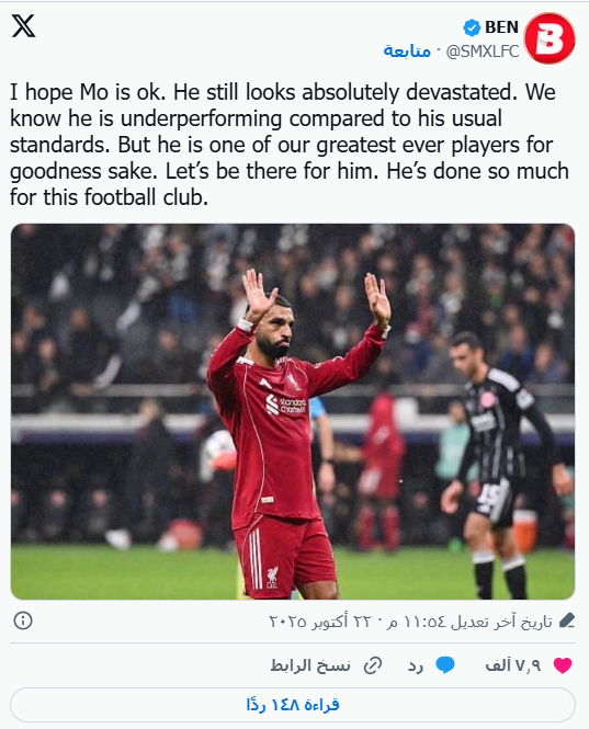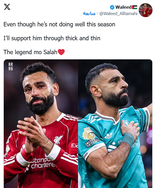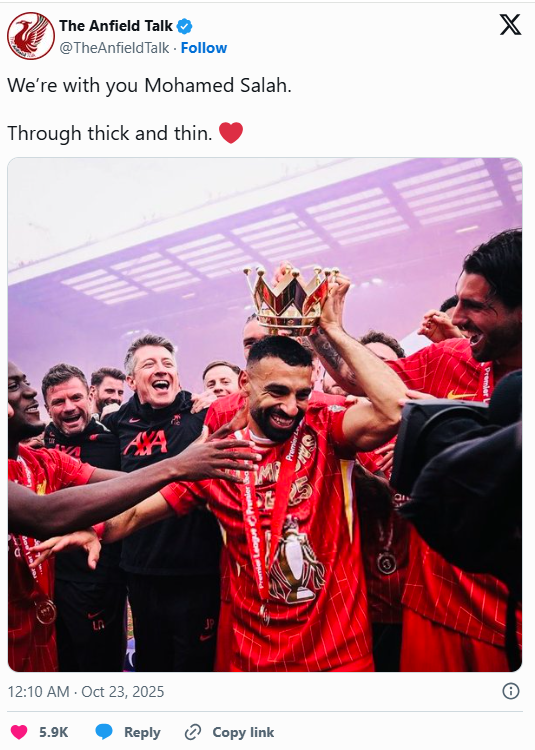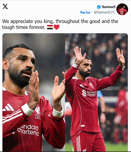 وحرص الحساب الجماهيري The Anfield Talk على توجيه رسالة خاصة لمحمد صلاح عبر موقع "أكس": "نحن معك يا محمد صلاح، في السراء والضراء".