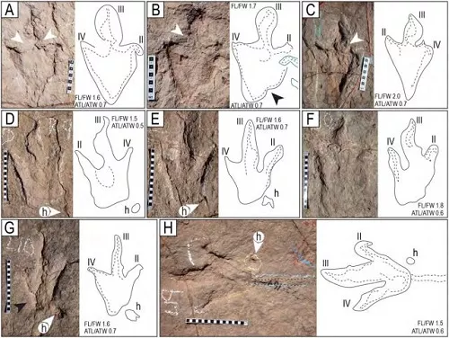ولا يقتصر الموقع على آثار الأقدام فقط، بل يحتوي على علامات مخالب، وخدوش أقدام، وآثار ذيل، تظهر كيف سبحت الديناصورات في الماء، إذ يتروح حجم آثار الأقدام بين أكثر من 30 سنتيمترا وأقل من 10 سنتيمترات، مع توجيه رئيسي للآثار يشير إلى حركة ذهاب وإياب على طول الشاطئ.