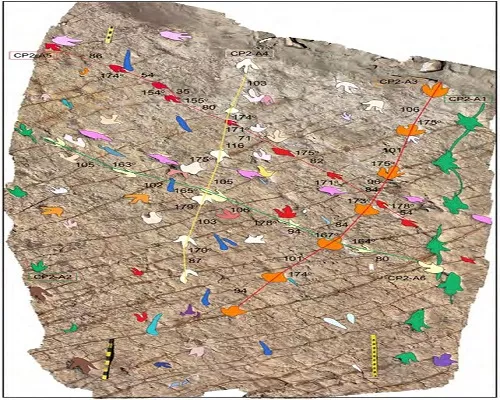 يتضمن الموقع عددا قياسيا من آثار الأقدام ثلاثية الأصابع، بلغ 16,600 أثر، موزعة على 1,321 مسارا و289 أثرًا منفردًا، إضافة إلى 1,378 أثر سباحة على 280 مسارا. جميعها تنتمي إلى فصيلة الثيروبودات، وهي مجموعة تشمل جميع الديناصورات آكلة اللحوم، إضافة إلى الطيور الحديثة.