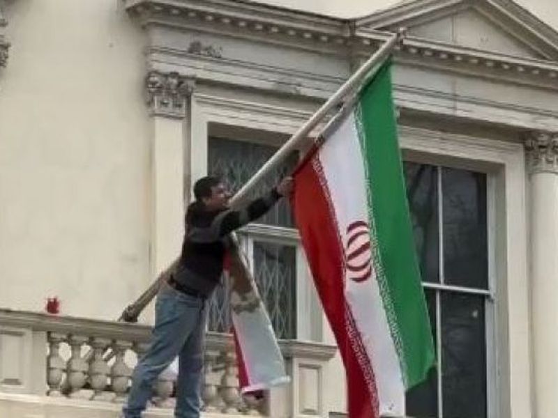 وخلال الوقفة الاحتجاجية التي جرت في منطقة كنسينغتون بلندن، تسلق أحد المحتجين شرفة السفارة وأنزل العلم الإيراني، رافعا بيديه علم الملكية قبل قيام الثورة، فيما أعلنت شرطة لندن أنها أوقفت شخصا بتهمة دخول ممتلكات السفارة دون إذن.