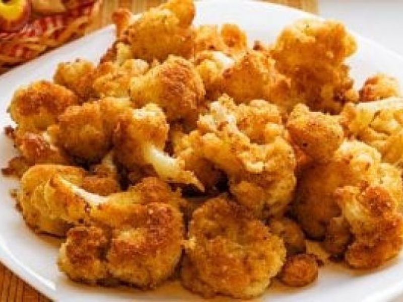 - تُغمس زهرات القرنبيط أولًا في الدقيق، ثم في البيض، ثم في البقسماط حتى تُغطى جيدًا.