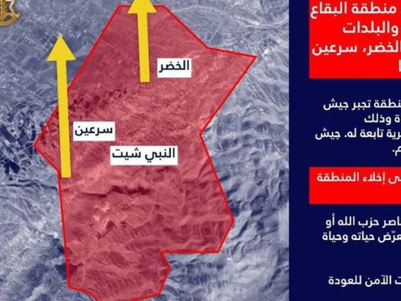 وشدد البيان على ضرورة الإخلاء الفوري قائلاً: "لضمان سلامتكم ندعوكم إلى إخلاء المنطقة فوراً والتوجه شمالاً. كل من يتواجد بالقرب من عناصر حزب الله أو منشآته أو وسائله القتالية يعرّض حياته وحياة أفراد عائلته للخطر".