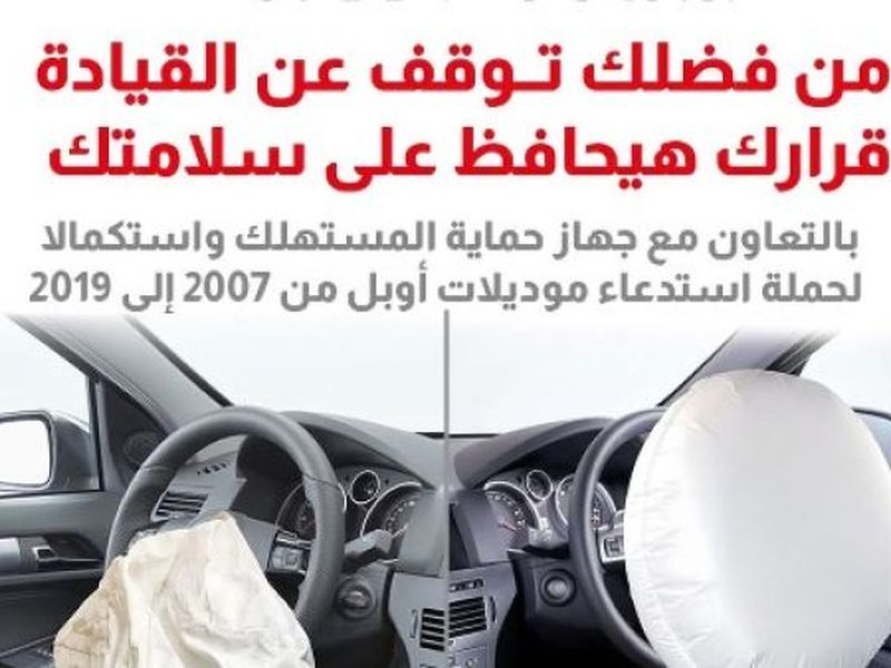 يُناشد جهاز حماية المستهلك جميع المستهلكين مالكي هذه الطرازات التوجه لمراكز الخدمة المعتمدة علي مستوي الجمهورية للتغيير المجاني للوسائد .. صدى البلد : المصدر بشكل عاجل.. حماية المستهلك يستدعي سيارات "اوبل" من انتاج 2007 وحتى 2019