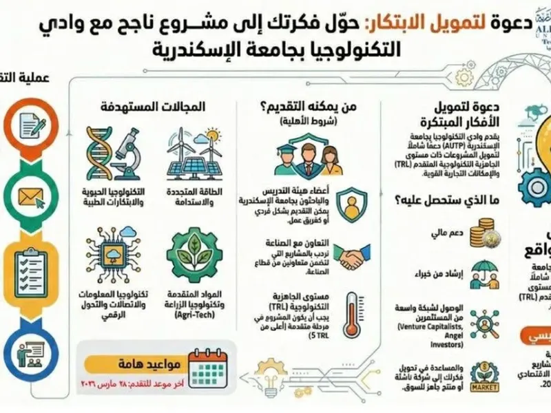 يمتد لـ28 مارس.. وادى التكنولوجيا بجامعة الإسكندرية يستقبل طلبات التقدم لـ«أطلق ابتكارك»