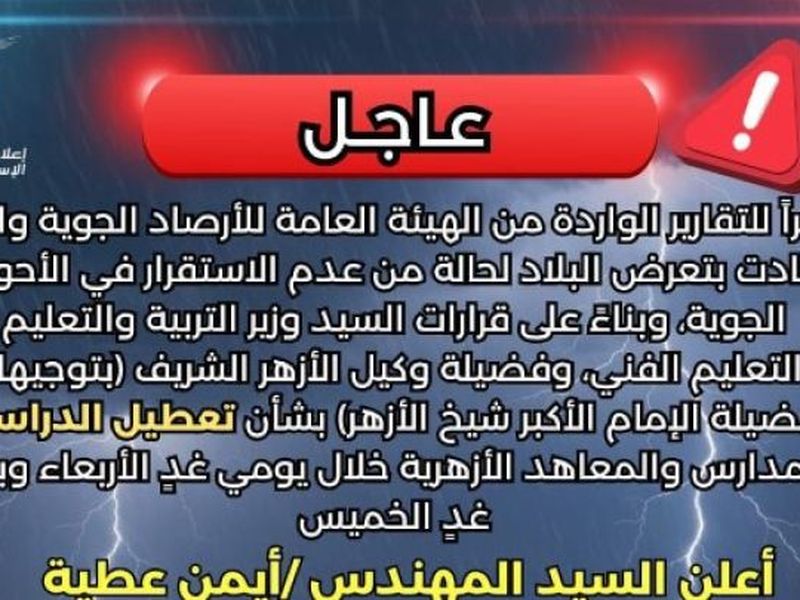 أعلن المهندس أيمن عطية محافظ الإسكندرية، منح إجازة استثنائية يومي غدٍ الأربعاء وبعد غدٍ الخميس ٢٥ و٢٦ مارس ٢٠٢٦ صدى البلد : المصدر قرار عاجل بـ إجازة رسمية في الإسكندرية لهذه الفئات لسوء الأحوال الجوية