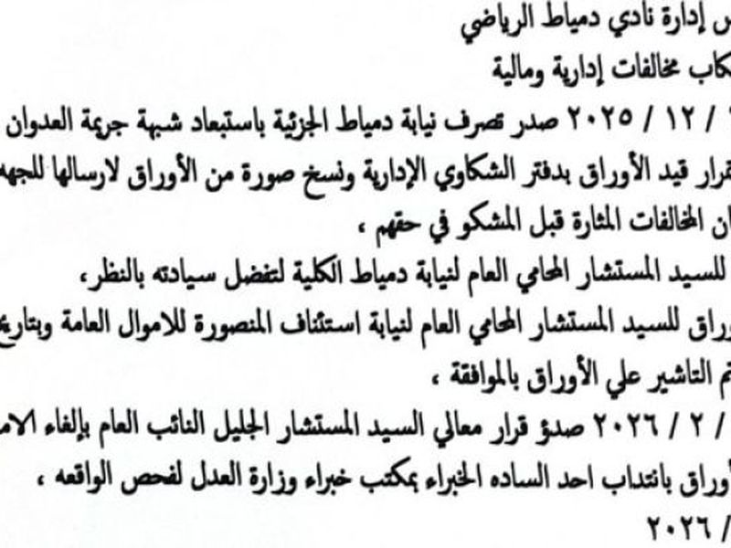 أمر المستشار النائب العام بإعادة فتح التحقيقات في المخالفات الإدارية والمالية المنسوبة إلى مجلس إدارة نادي دمياط السابق برئاسة