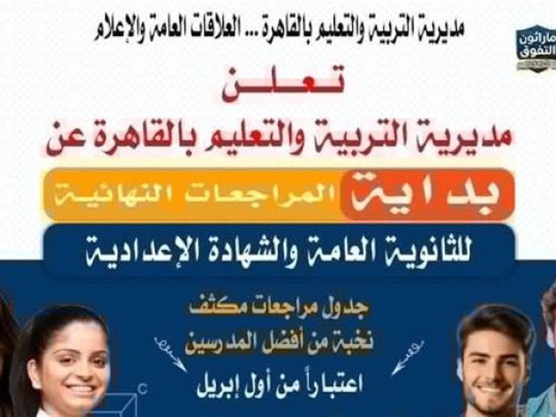 تعلن مديرية التربية والتعليم بالقاهرة عن بدء المراجعات النهائية المجانية لطلاب الشهادات العامة (الثانوية العامة – الشهادة الإعدادية) بجميع الإدارات التعليمية اعتبارًا من اول ابريل مع نخبة متميزة من أفضل المعلمين داخل أماكن مجهزة بالكامل. وذلك في إطار حرص مديرية التربية والتعليم بالقاهرة على دعم أبنائها
