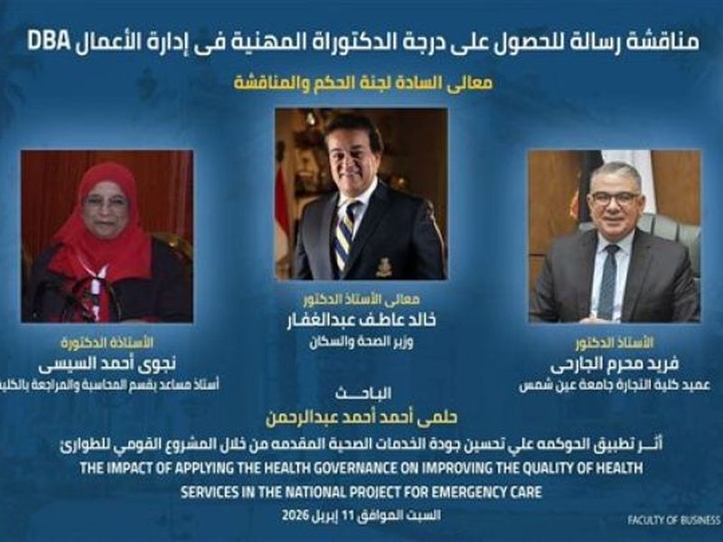 بحضور وزير الصحة.. تجارة عين شمس تناقش رسالة دكتوراه حول "حوكمة الخدمات الصحية للطوارئ"