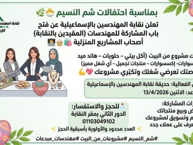 نقابة المهندسين بالإسماعيلية تفتح باب المشاركة للمهندسات أصحاب المشروعات المنزلية خلال احتفالات شم النسيم